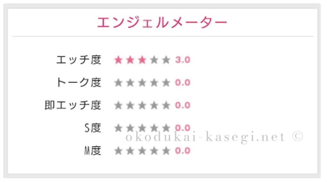 エンジェルメーターとは、 「エッチ度」「トーク度」「即エッチ度」「S度」「M度」の5項目を★マークで設定する指標です。