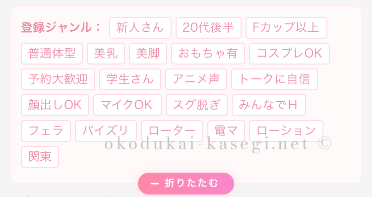 「新人さん」「顔出しOK」「マイクOK」「アニメ声」など、自分に当てはまるジャンルを、できるだけ多く(自分ができる範囲で)設定しましょう。
