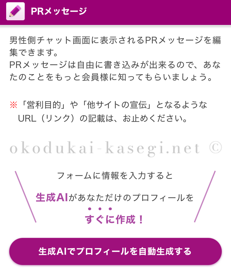 「どうしても自分ではプロフィールのPRメッセージをうまく書けない」という方は、AIに作成してもらうこともできます!